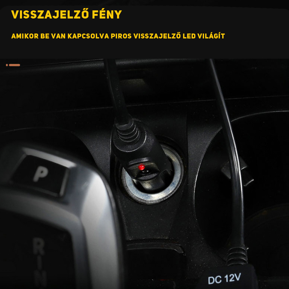 Szivargyujtós áramellátással rendelkezik. A kábel hossza 100cm+ a szivargyujtós vég.